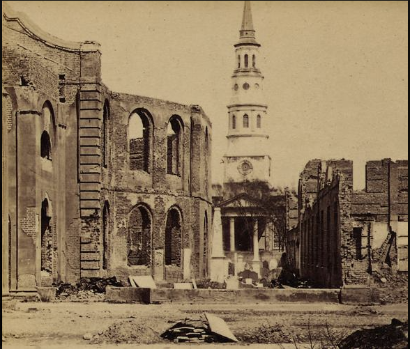 Burning through the Market, a southerly shift in the winds drove the fire down Meeting Street, leaving both the Circular Church and S.C. Institute Hall, where the Ordinance of Secession had been signed, in ashes and rubble.