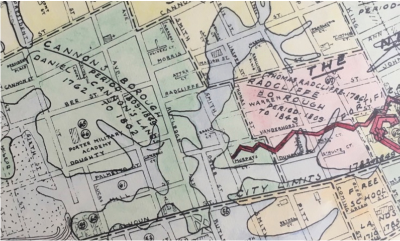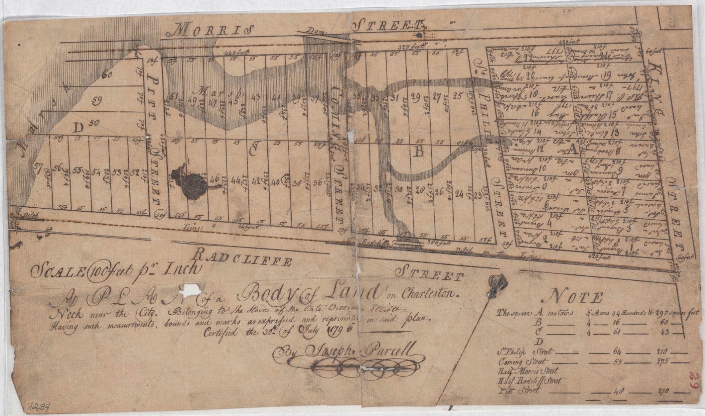 Successful planter Thomas Radcliffe purchased a rural tract of land near the center of Charleston’s peninsula in 1786 with the intention of developing a farm on it. A farm in the middle of downtown may seem odd to us now, but back then the area roughly bordered by today’s King, Morris, and Radcliffe streets, as well as what was once marsh on its western edge, was considered out in the country.